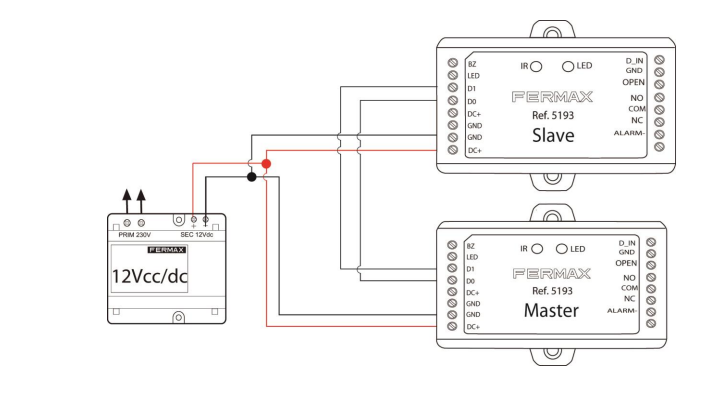 The cloning function of the MINI WiFi door controller WG 1 PTA WiFi ref 5193 allows us to transfer users registered locally (via the master card or IR remote control) from one mini WiFi controller to another. To do this, connect the Master controller (the one containing the users) to the Slave controller (the one that will receive the user transfer) as indicated below.