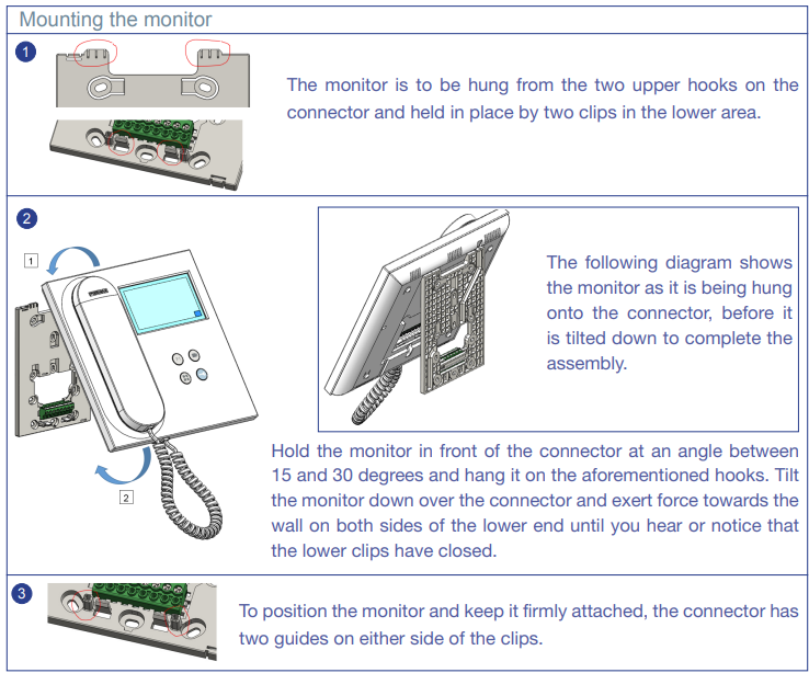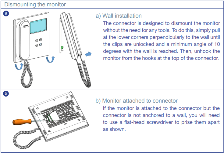 To remove the monitor from the wall, hold the monitor firmly on both sides with your hands at the lowest part and use a little force to pull it away from the wall, wait 10 seconds and reconnect it as shown in the picture below (you can use a lever or flat-head screwdriver to pry it off):