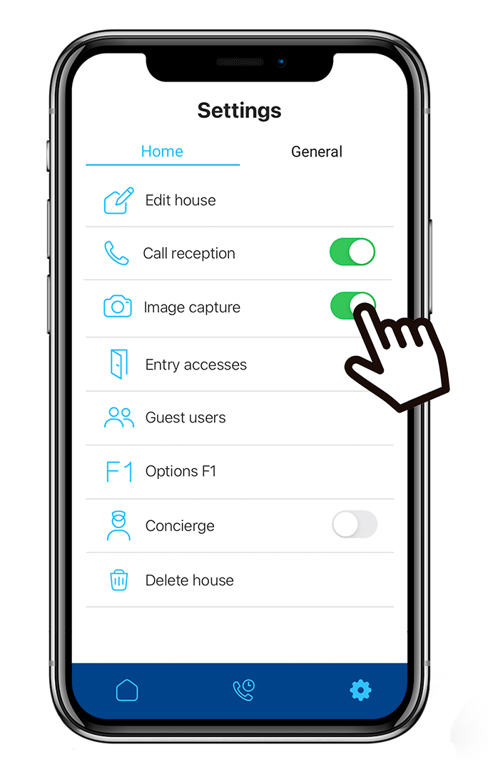 On any type of monitor (Fermax indoor terminal with screen), you can enable or disable the function by pressing the menu button > settings > and selecting the camera icon. The changes will be synchronised in the app.