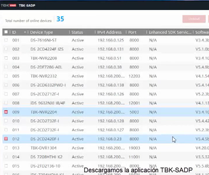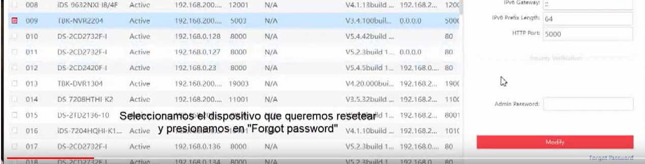1º Descargar TBK-SADP y encontraremos la cámara IP que queremos resetear contraseña.