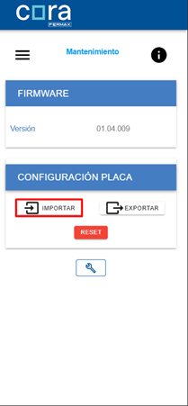 - Una vez en la sección de mantenimiento debemos pulsar al botón de importar en el apartado de configuración de la placa y seleccionamos el archivo generado previamente con la configuración.