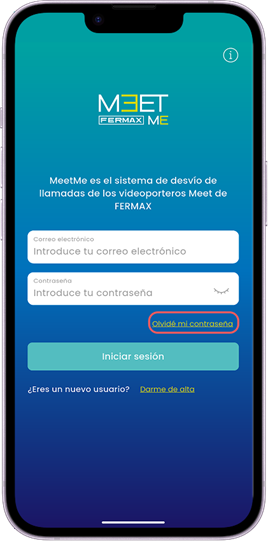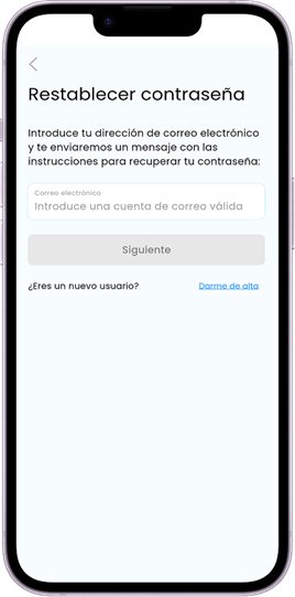 1. Inicia el proceso de restaurar la contraseña pulsando a Olvidé mi contraseña en la pantalla de inicio de la app.